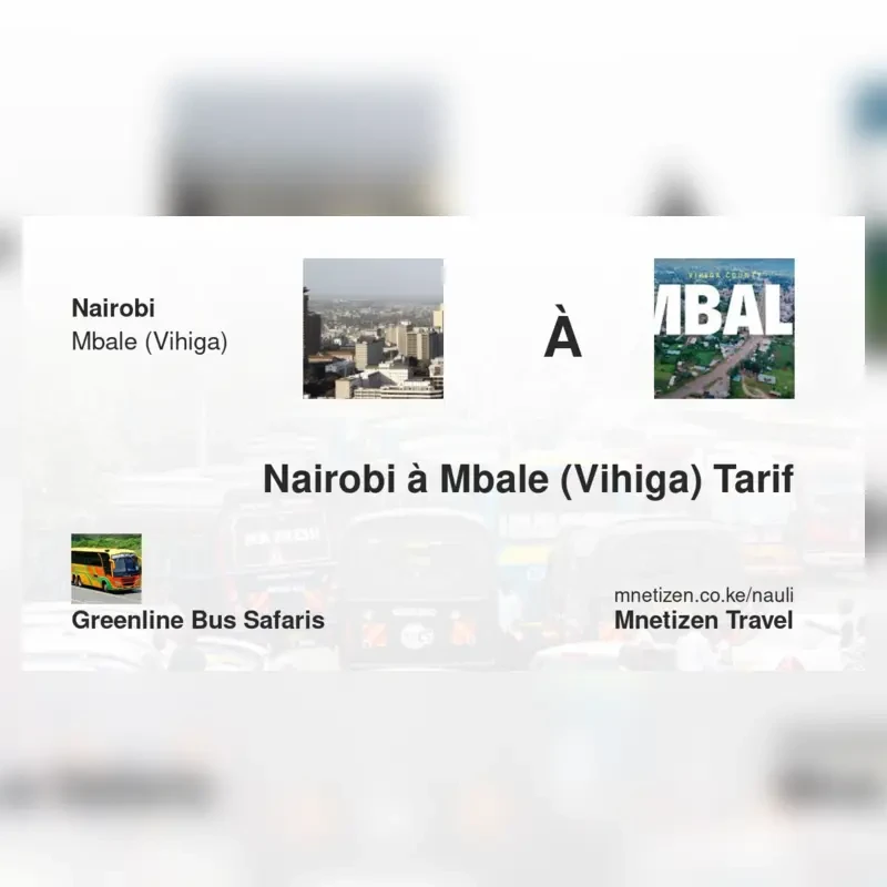 The fare from Nairobi to Mbale (Vihiga) with Greenline Bus Safaris is . Prices may vary during holidays and school terms.