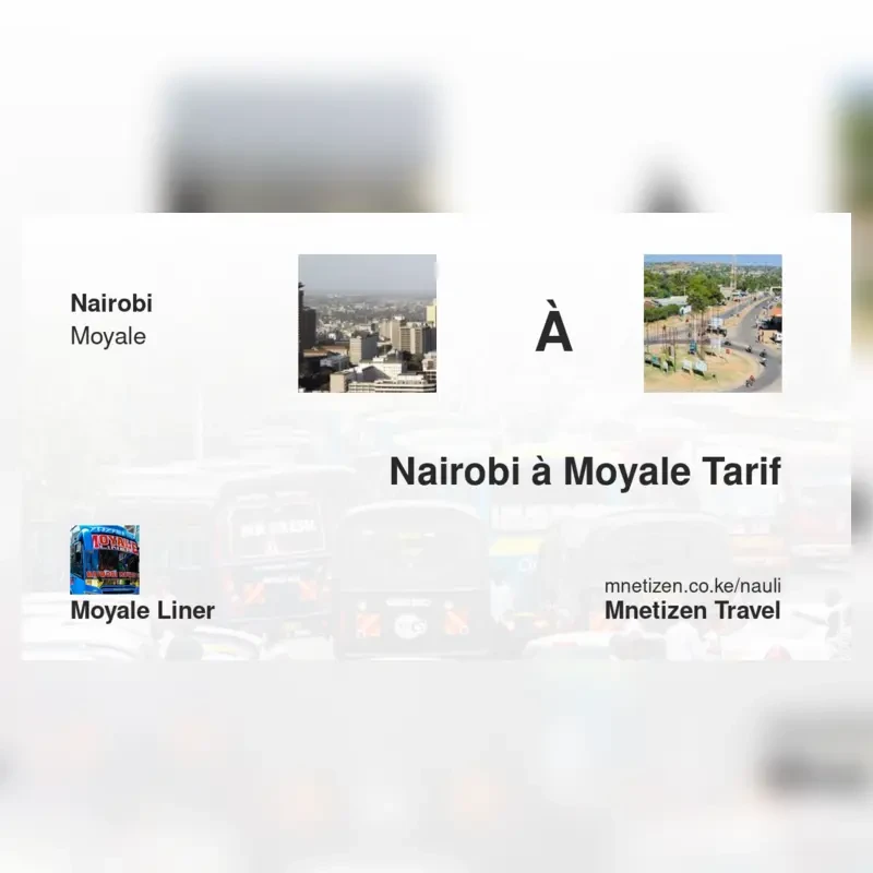 The fare from Nairobi to Moyale with Moyale Liner is . Prices may vary during holidays and school terms.