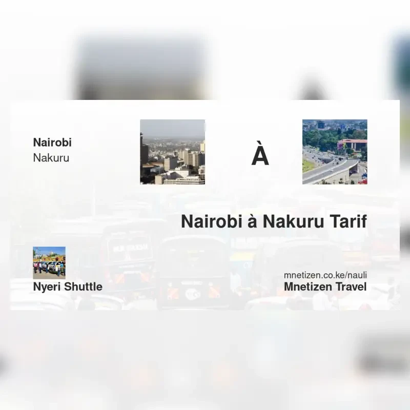 The fare from Nairobi to Nakuru with Nyeri Shuttle is . Prices may vary during holidays and school terms.