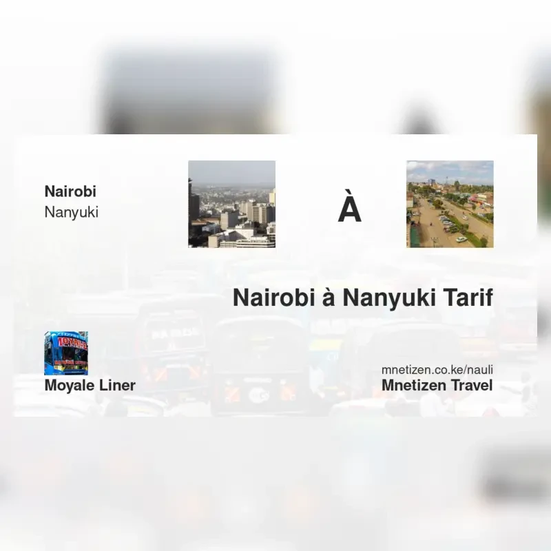 The fare from Nairobi to Nanyuki with Moyale Liner is . Prices may vary during holidays and school terms.