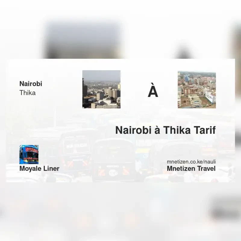 The fare from Nairobi to Thika with Moyale Liner is . Prices may vary during holidays and school terms.