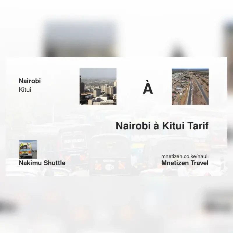 The fare from Nairobi to Kitui with Nakimu Shuttle is . Prices may vary during holidays and school terms.
