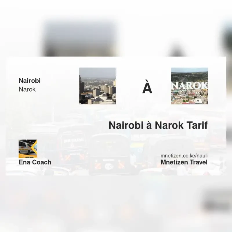 The fare from Nairobi to Narok with ENA Coach is . Prices may vary during holidays and school terms.