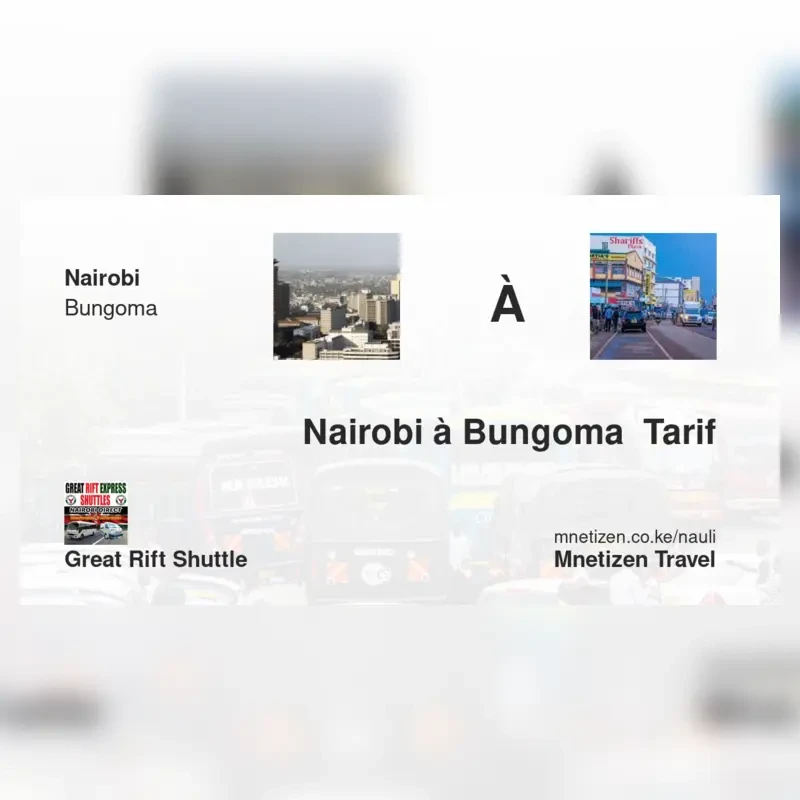 The fare from Nairobi to Bungoma with Great rift shuttle is . Prices may vary during holidays and school terms.