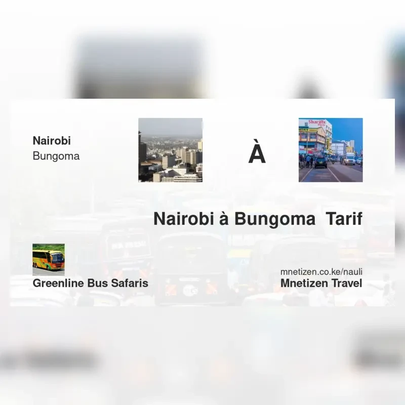 The fare from Nairobi to Bungoma with Greenline Bus Safaris is . Prices may vary during holidays and school terms.