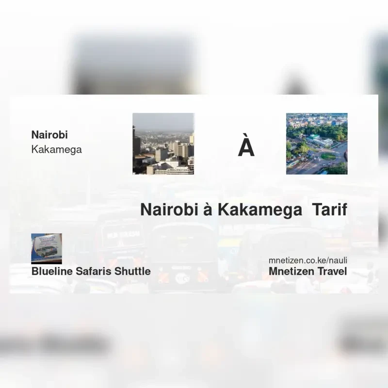 The fare from Nairobi to Kakamega with Blueline Safaris Shuttle is . Prices may vary during holidays and school terms.
