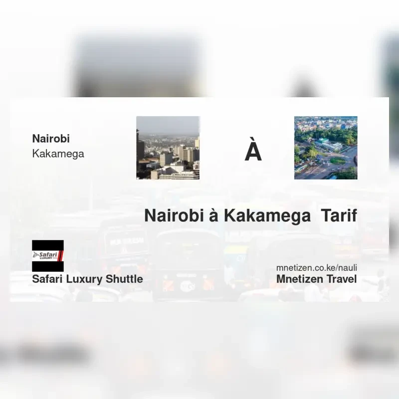 The fare from Nairobi to Kakamega with Safari Luxury Shuttle is . Prices may vary during holidays and school terms.
