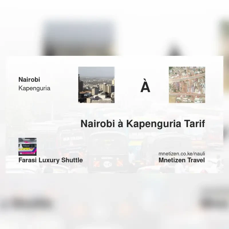 | Nairobi Chwele | Farasi luxury shuttle Shuttle | – | – | ksh 1,800 Book |