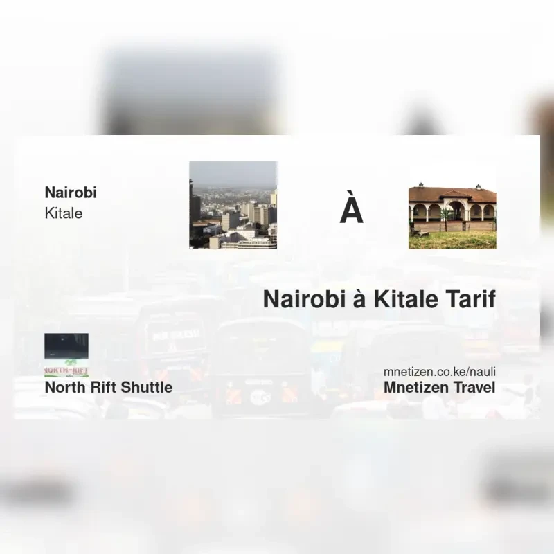 The fare from Nairobi to Kitale with North Rift Shuttle is . Prices may vary during holidays and school terms.