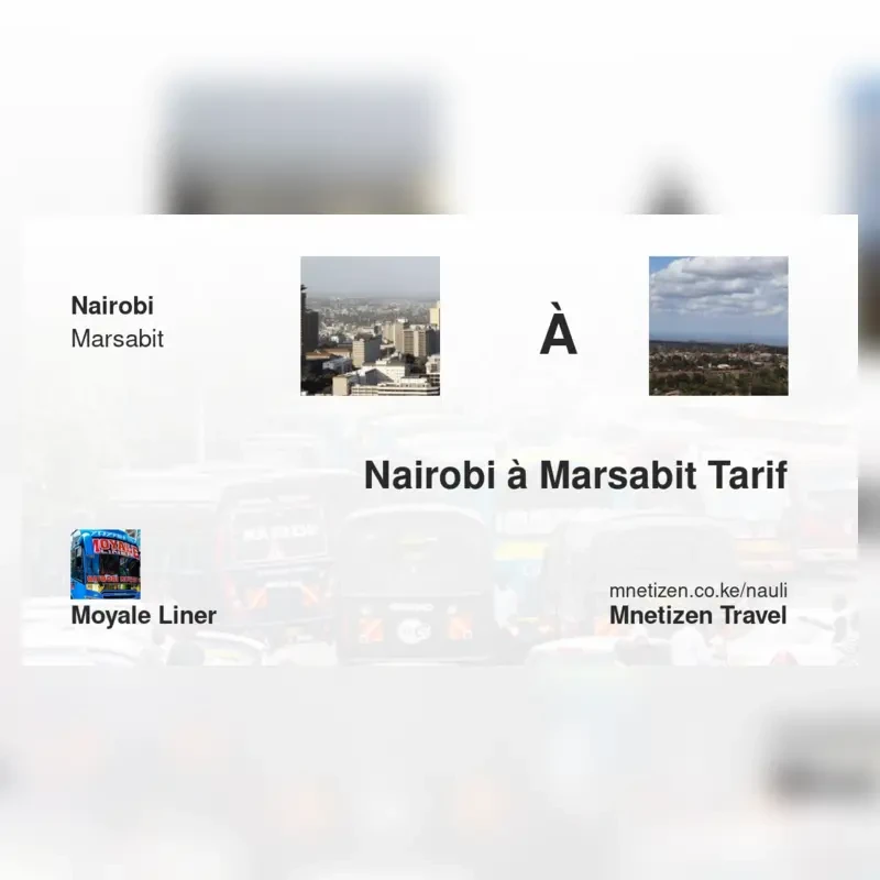 The fare from Nairobi to Marsabit with Moyale Liner is . Prices may vary during holidays and school terms.
