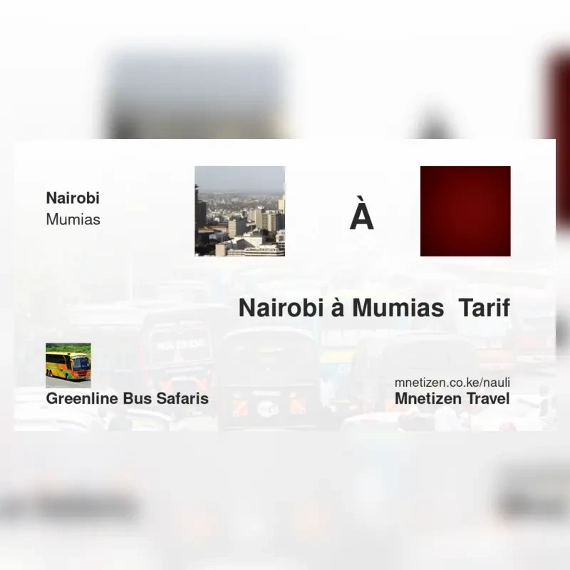 The fare from Nairobi to Mumias with Greenline Bus Safaris is . Prices may vary during holidays and school terms.