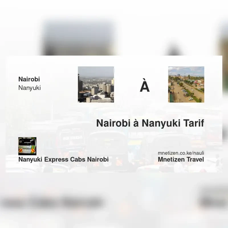 The fare from Nairobi to Nanyuki with Nanyuki Express Cabs Nairobi is . Prices may vary during holidays and school terms.