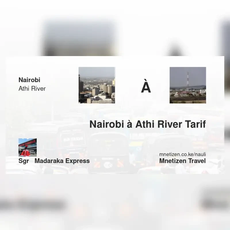 | Nairobi Athi river | Sgr - madaraka express Train | 30 Kms | 15 mins | ksh 90 Book |