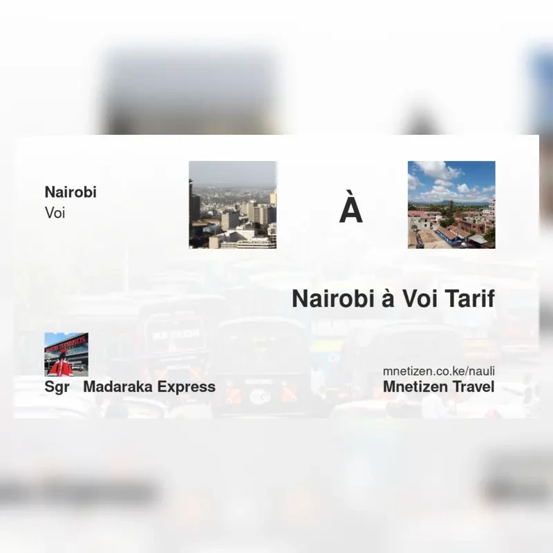 | Nairobi Voi | Sgr - madaraka express Train | 329 Kms | 3 hrs 30 Mins | ksh 1,050 Book |
