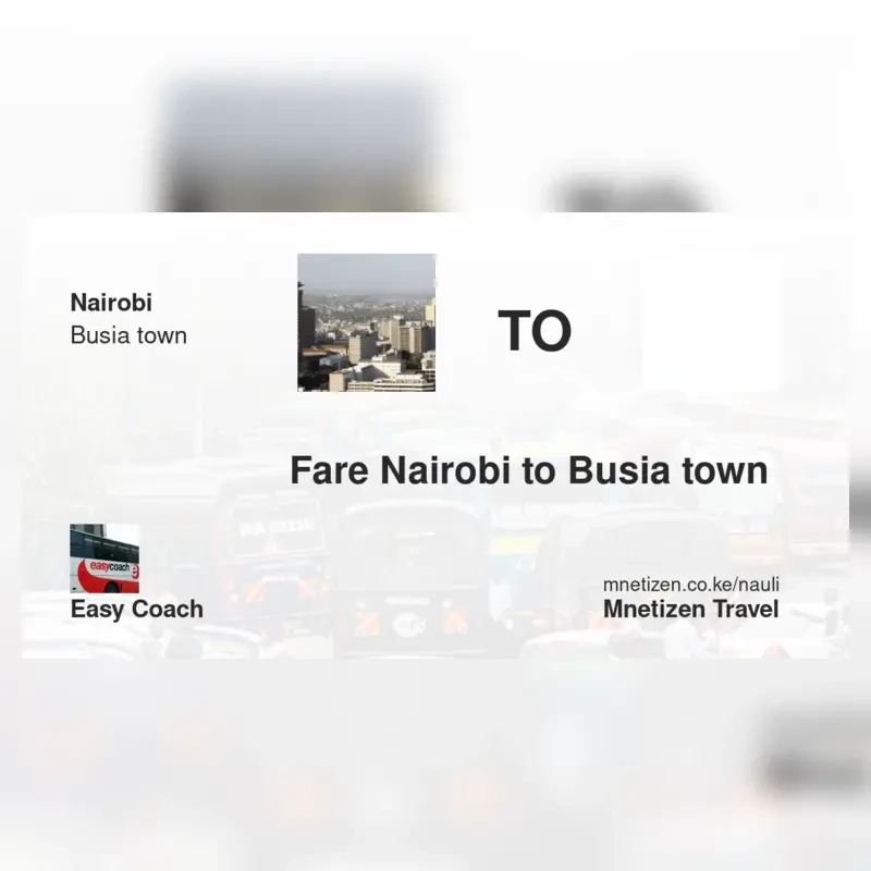 The fare from Nairobi to Busia Town with Easy Coach is . Prices may vary during holidays and school terms.