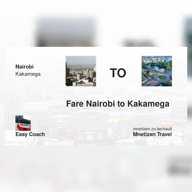 The fare from Nairobi to Kakamega with Easy Coach is . Prices may vary during holidays and school terms.