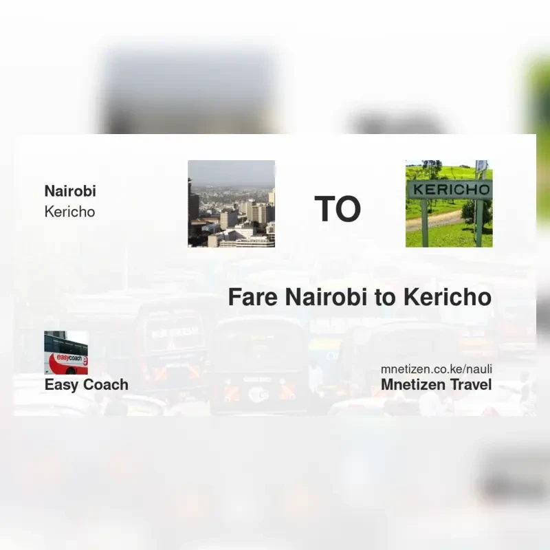 The fare from Nairobi to Kericho with Easy Coach is . Prices may vary during holidays and school terms.