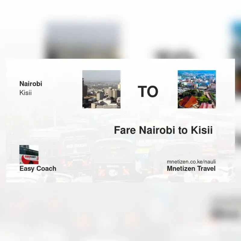 The fare from Nairobi to Kisii with Easy Coach is . Prices may vary during holidays and school terms.
