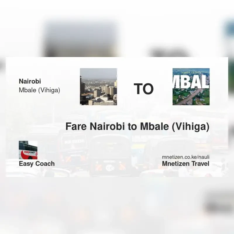 The fare from Nairobi to Mbale (Vihiga) with Easy Coach is . Prices may vary during holidays and school terms.