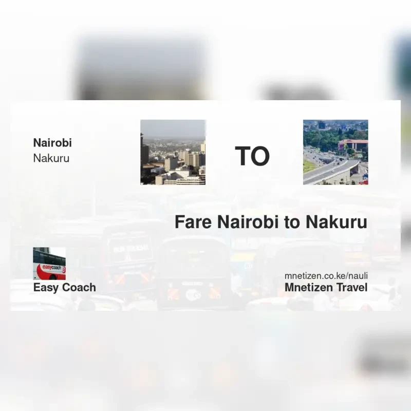 The fare from Nairobi to Nakuru with Easy Coach is . Prices may vary during holidays and school terms.