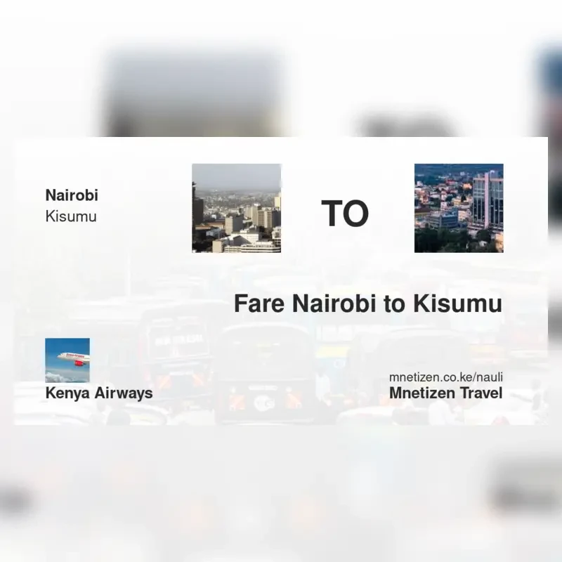 The fare from Nairobi to Kisumu with Kenya Airways is . Prices may vary during holidays and school terms.