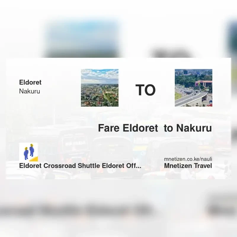 The fare from Eldoret to Nakuru with Eldoret crossroad shuttle Eldoret office is . Prices may vary during holidays and school terms.