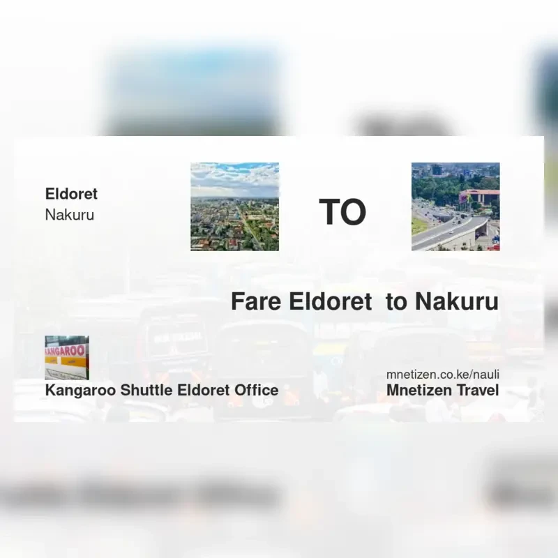 The fare from Eldoret to Nakuru with Kangaroo shuttle eldoret office is . Prices may vary during holidays and school terms.