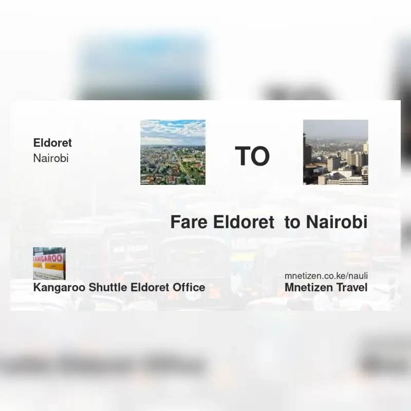 The fare from Eldoret to Nairobi with Kangaroo shuttle eldoret office is . Prices may vary during holidays and school terms.