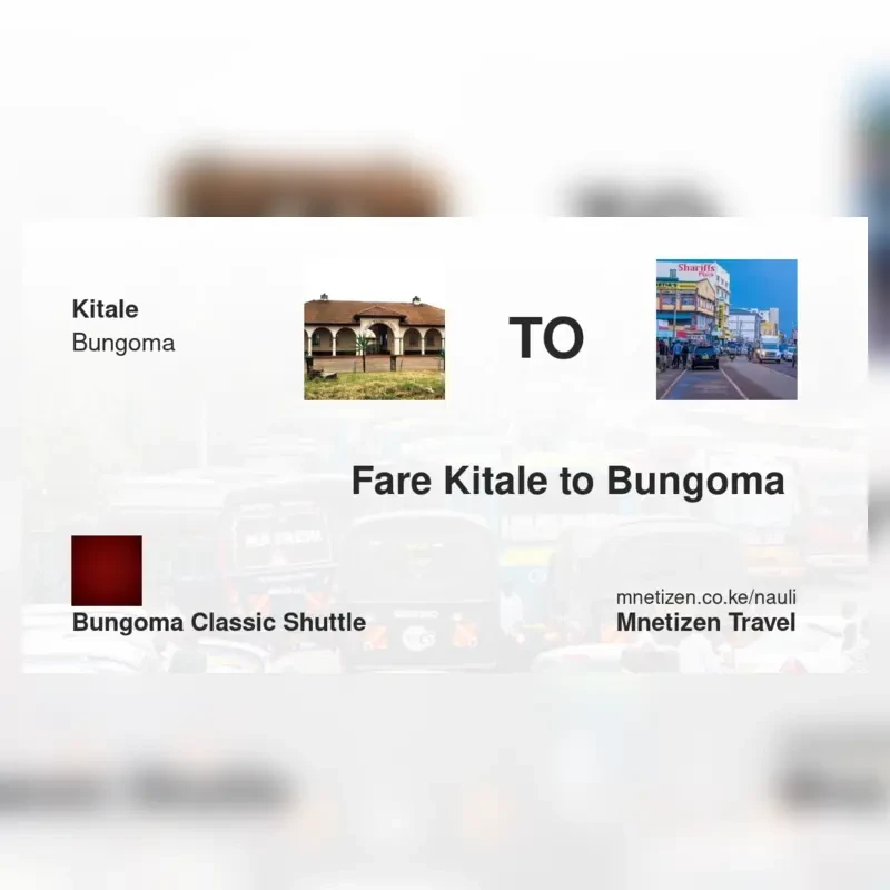 The fare from Kitale to Bungoma with Bungoma classic shuttle is . Prices may vary during holidays and school terms.
