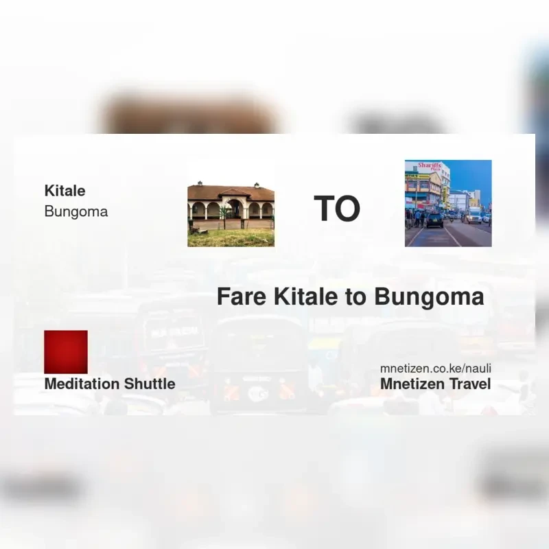 The fare from Kitale to Bungoma with Meditation shuttle is . Prices may vary during holidays and school terms.