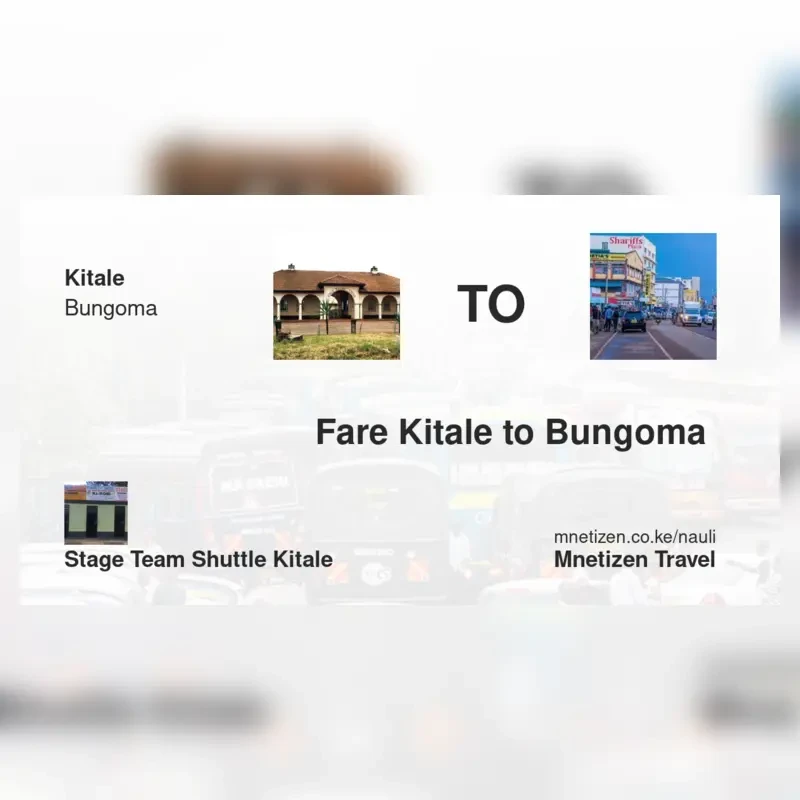 The fare from Kitale to Bungoma with STAGE TEAM SHUTTLE KITALE is . Prices may vary during holidays and school terms.