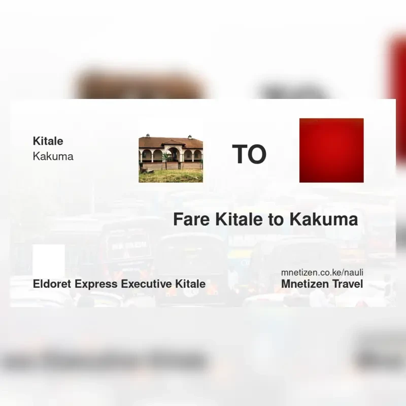 The fare from Kitale to Kakuma with Eldoret express executive kitale is . Prices may vary during holidays and school terms.
