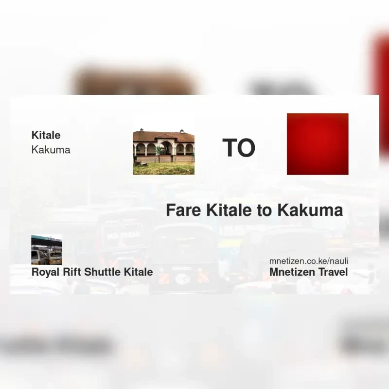 The fare from Kitale to Kakuma with Royal Rift Shuttle kitale is . Prices may vary during holidays and school terms.
