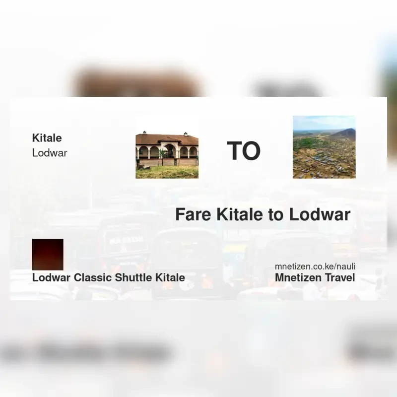 The fare from Kitale to Lodwar with Lodwar Classic shuttle kitale is . Prices may vary during holidays and school terms.