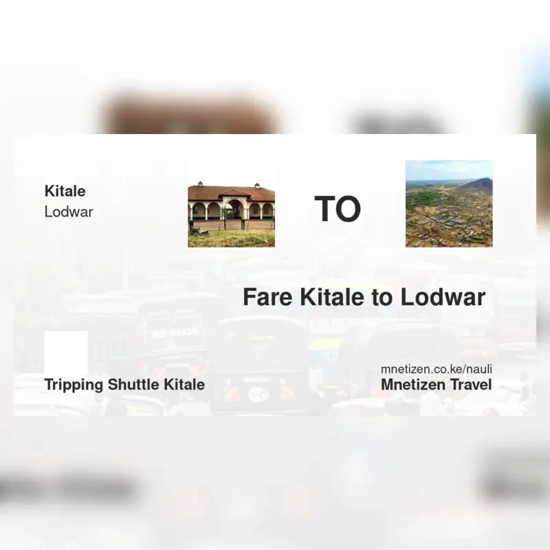 The fare from Kitale to Lodwar with Tripping shuttle kitale is . Prices may vary during holidays and school terms.