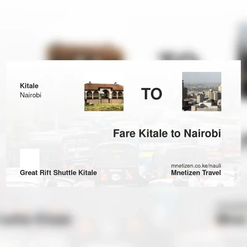 The fare from Kitale to Nairobi with Great Rift Shuttle kitale is . Prices may vary during holidays and school terms.