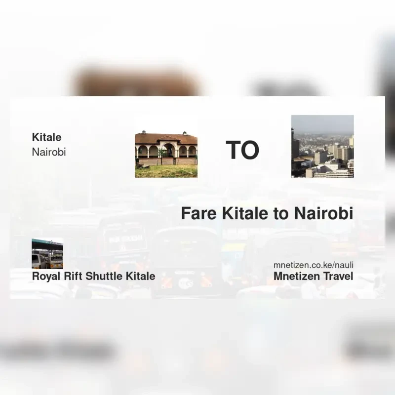 The fare from Kitale to Nairobi with Royal Rift Shuttle kitale is . Prices may vary during holidays and school terms.