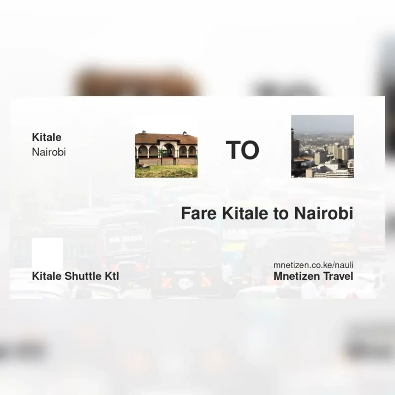 The fare from Kitale to Nairobi with Kitale shuttle ktl is . Prices may vary during holidays and school terms.