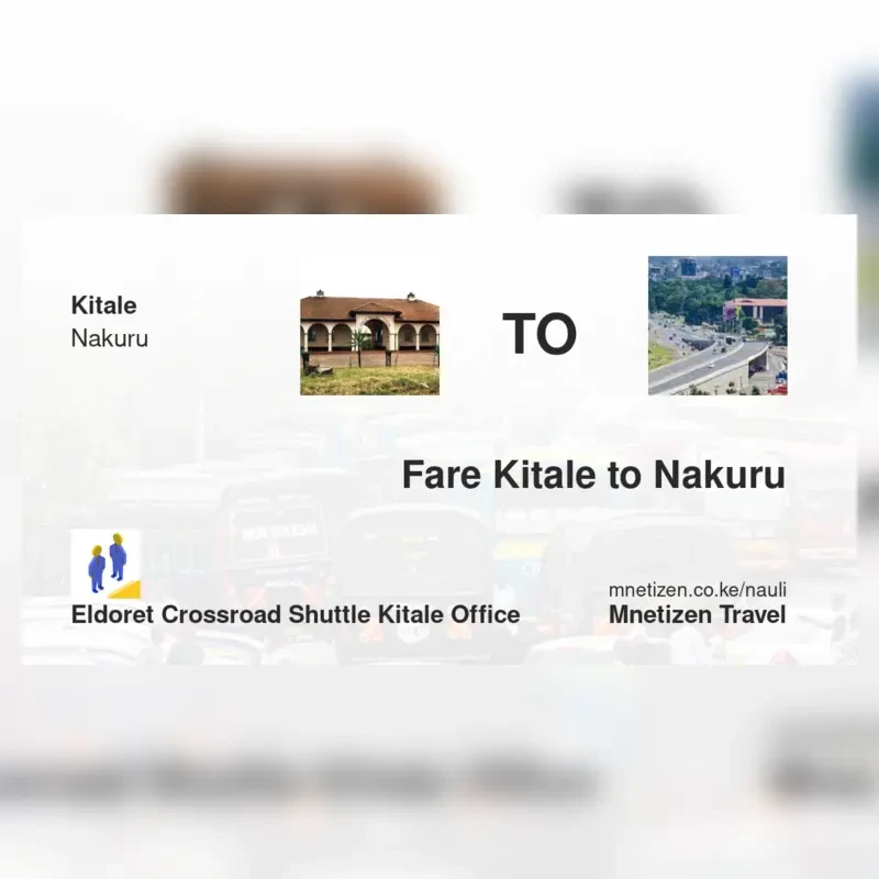 The fare from Kitale to Nakuru with Eldoret crossroad shuttle Kitale office is . Prices may vary during holidays and school terms.