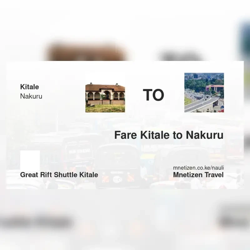 The fare from Kitale to Nakuru with Great Rift Shuttle kitale is . Prices may vary during holidays and school terms.