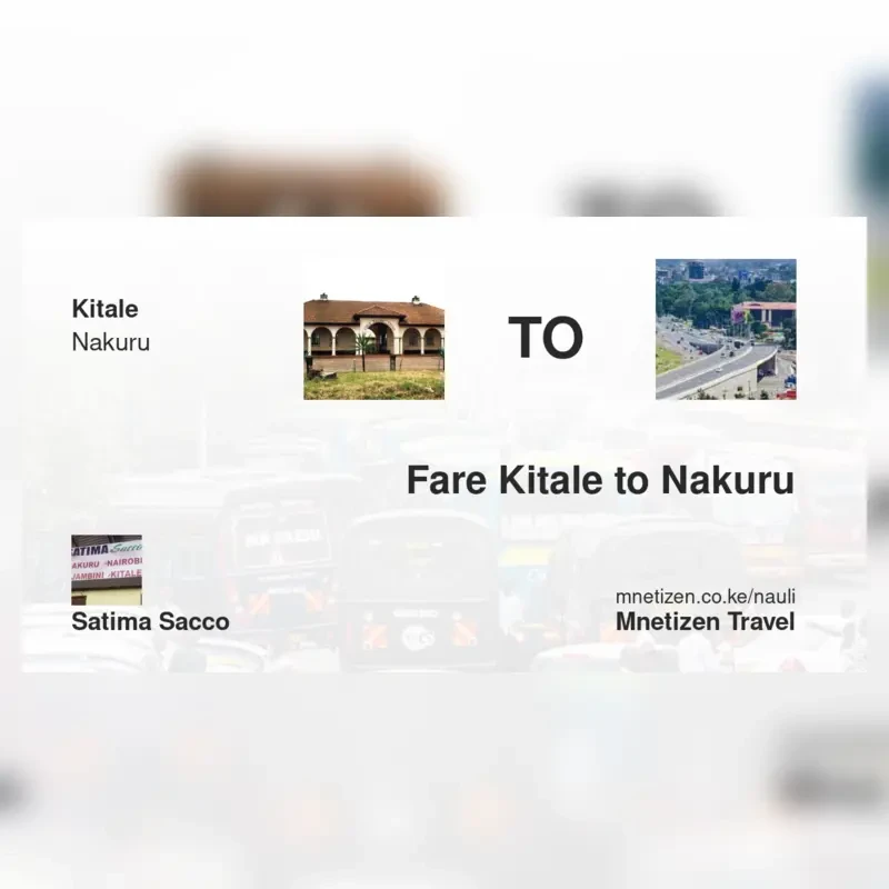 The fare from Kitale to Nakuru with Satima SACCO is . Prices may vary during holidays and school terms.
