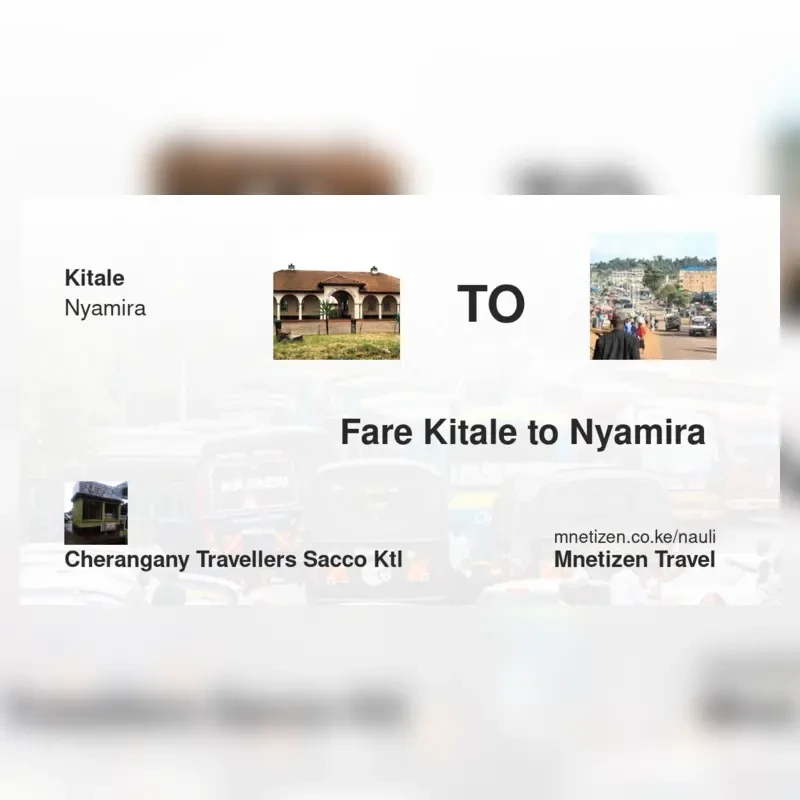 The fare from Kitale to Nyamira with Cherangany Travellers SACCO ktl is . Prices may vary during holidays and school terms.