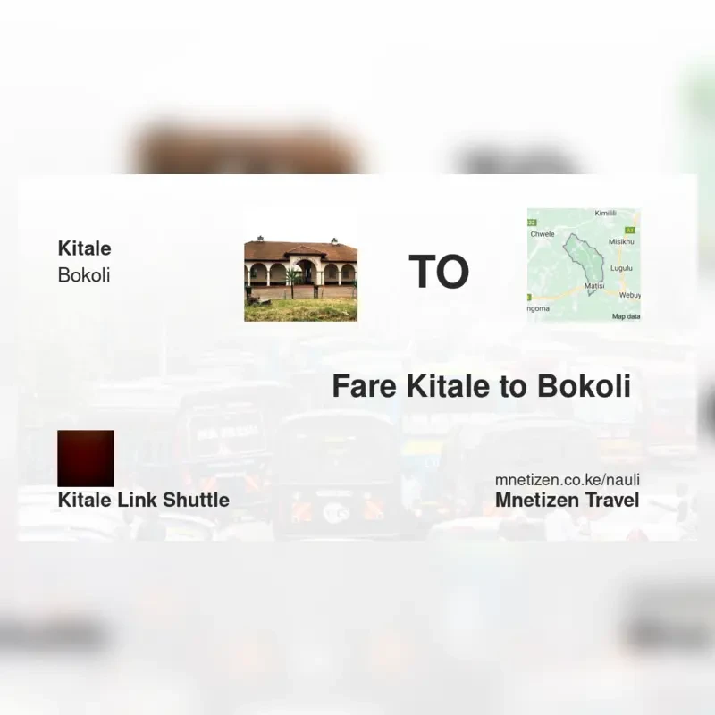 The fare from Kitale to Bokoli with Kitale Link shuttle is . Prices may vary during holidays and school terms.