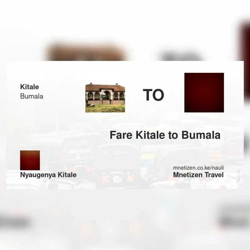 The fare from Kitale to Bumala with Nyaugenya kitale is . Prices may vary during holidays and school terms.