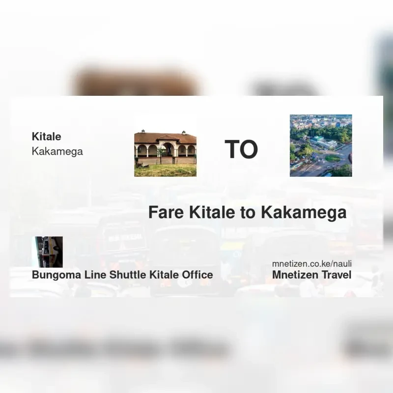 The fare from Kitale to Kakamega with Bungoma line shuttle Kitale office is . Prices may vary during holidays and school terms.