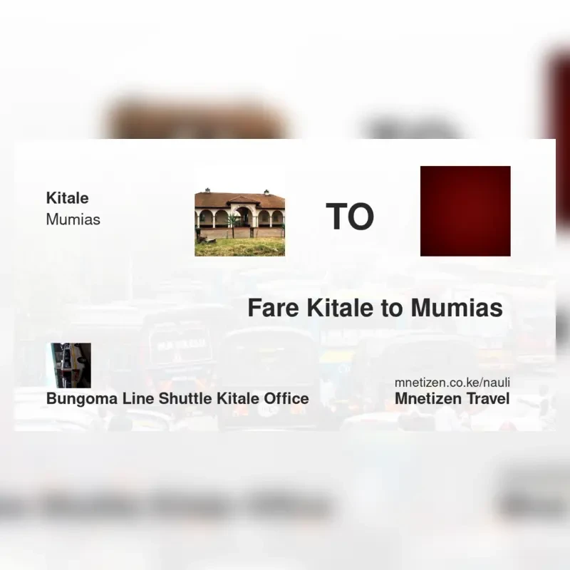 The fare from Kitale to Mumias with Bungoma line shuttle Kitale office is . Prices may vary during holidays and school terms.