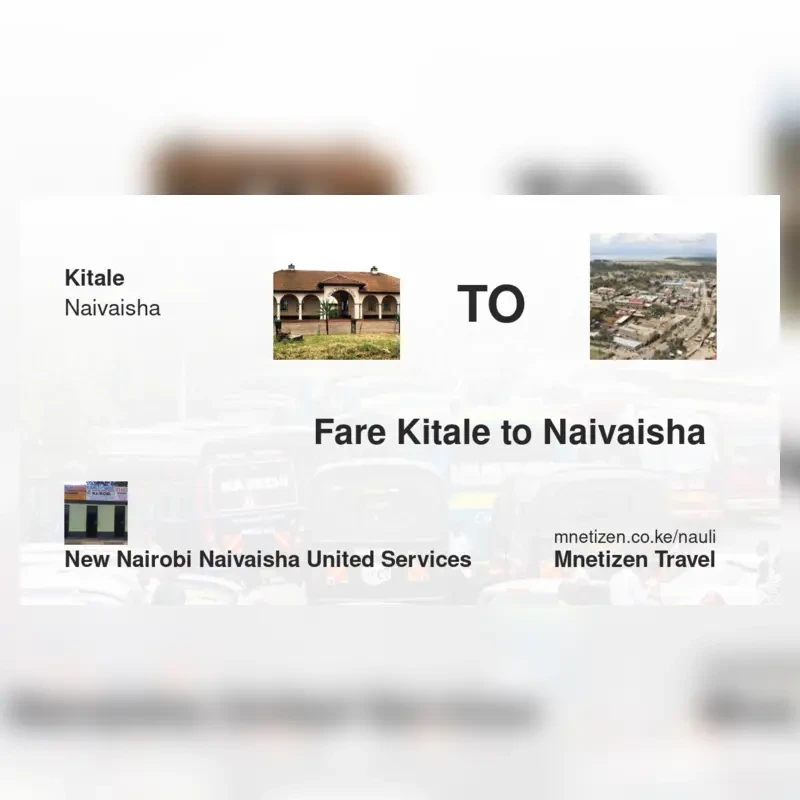 The fare from Kitale to Naivaisha with New Nairobi naivaisha United Services is . Prices may vary during holidays and school terms.