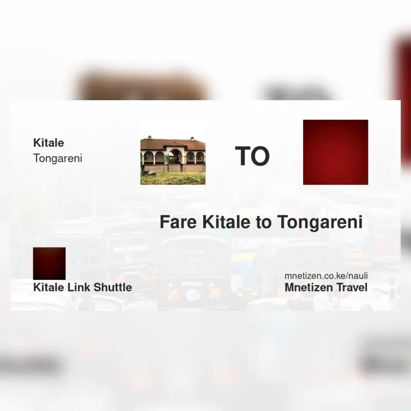 The fare from Kitale to Tongareni with Kitale Link shuttle is . Prices may vary during holidays and school terms.