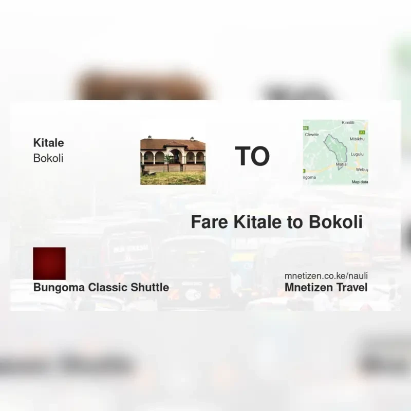 The fare from Kitale to Bokoli with Bungoma classic shuttle is . Prices may vary during holidays and school terms.