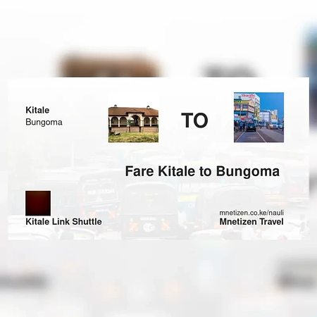 The fare from Kitale to Bungoma with Kitale Link shuttle is . Prices may vary during holidays and school terms.